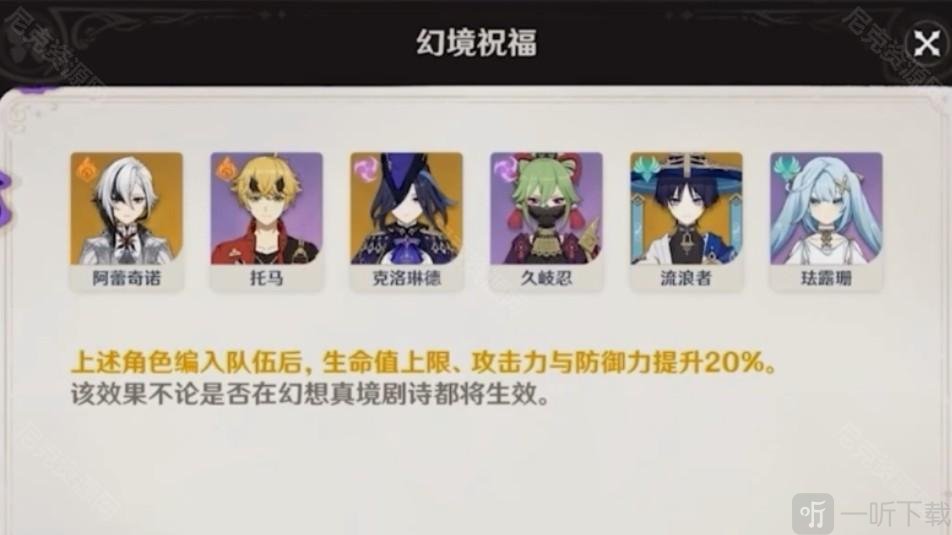 另外,每期「幻想真境剧诗」的开幕角色将获得「幻境祝福」,为他们提供增益效果。不仅在本玩法内,在大世界的冒险中都会生效。