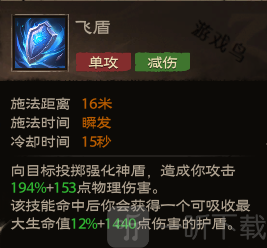 效果:向目标投掷强化神盾,造成你攻击194%+153点物理伤害。该技能命中后你会获得一个可吸收最大生命值12%+1440点伤害的护盾。