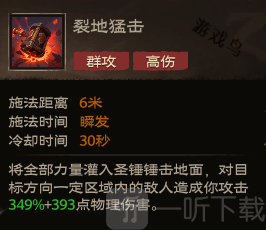 效果:将全部力量灌入圣锤锤击地面,对目标方向一定区域内的敌人造成你攻击349%+393点物理伤害。