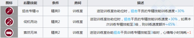 w的基建技能秉承了很多高星干员的传统,用处一般,只有一个狙击干员技能专精速度增加的效果,其实在专精3时的加速其实也是不错了,但是因为技能专精类加速本身没有制造站和贸易站技能有用,所以用处还是有限。