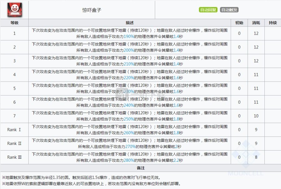 w的2技能更加偏向于处理大波中低甲敌人,这个技能的回转算是很好了,w会优先往有敌人的地方放置地雷,如果攻击范围内没有敌人,则会在攻击范围内随机释放,需要注意的是,地雷实际上是一个干员,是不能在不能部署干员的地方放置地雷的,当然大家如果嫌地雷碍事的话,也可以手动撤离的。因为地雷的放置和爆炸都是不可控,所以这个技能其实上限不高,但是胜在自动释放,非常的省心省力,懒人刀客塔专用,而且在没有敌人的时候也会自动释放,时间长的话甚至可以储存出地雷阵,虽然地雷持续时间有上限,但是不得不说这也是一个很棒的优点,技能专精的优先级在3技能之下。